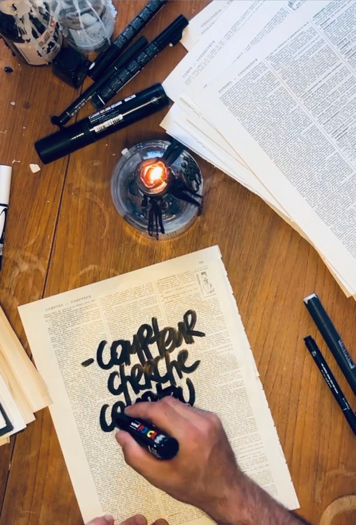 L'artiste L'oiseau noir réalise ses œuvres dans son atelier avec différents outils graphiques. Chaque œuvres est unique.